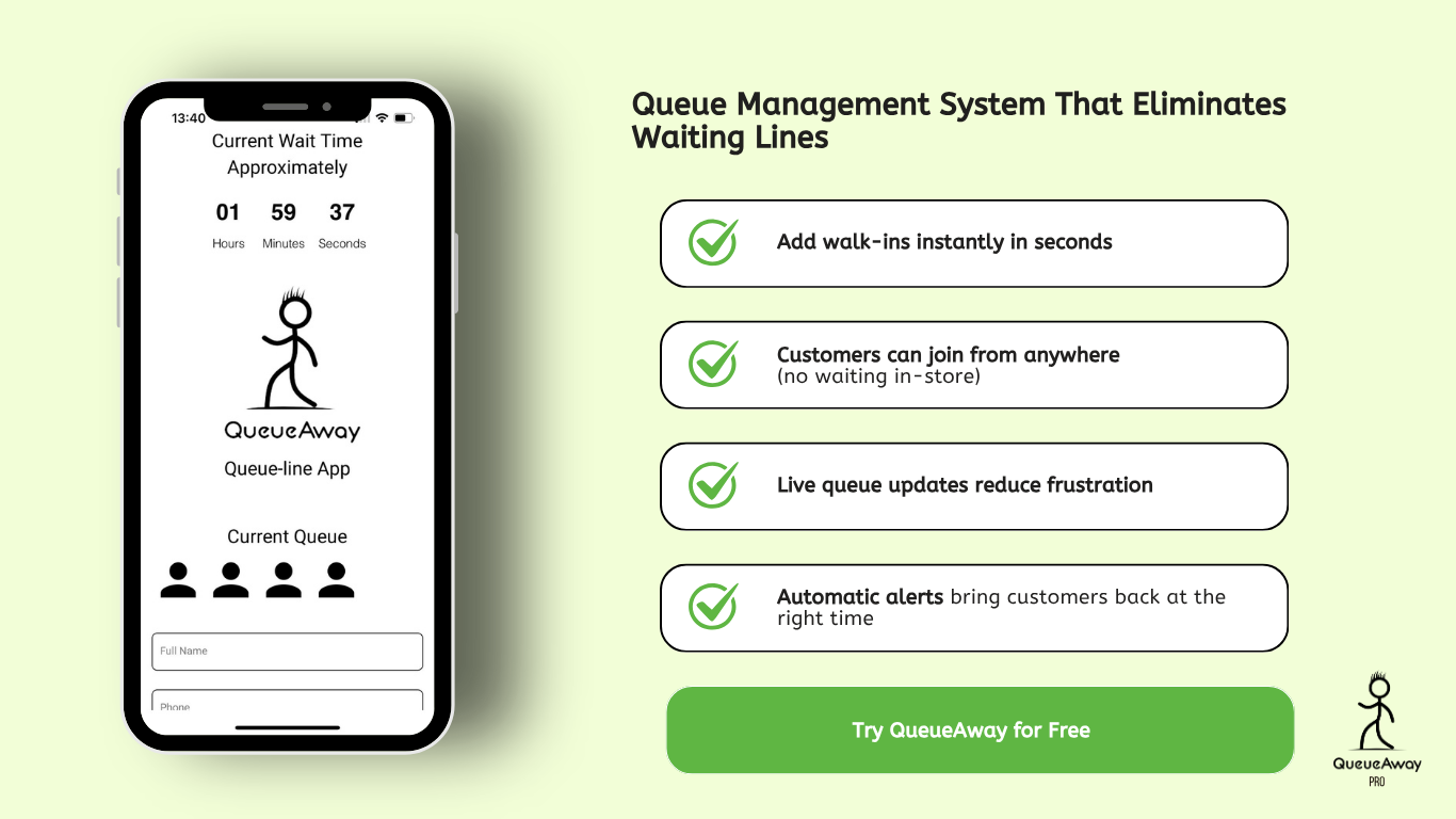For businesses searching for queuing apps or an online queue system free to try, QueueAway offers a simple, scalable solution that works across retail, hospitality, healthcare, and service environments.